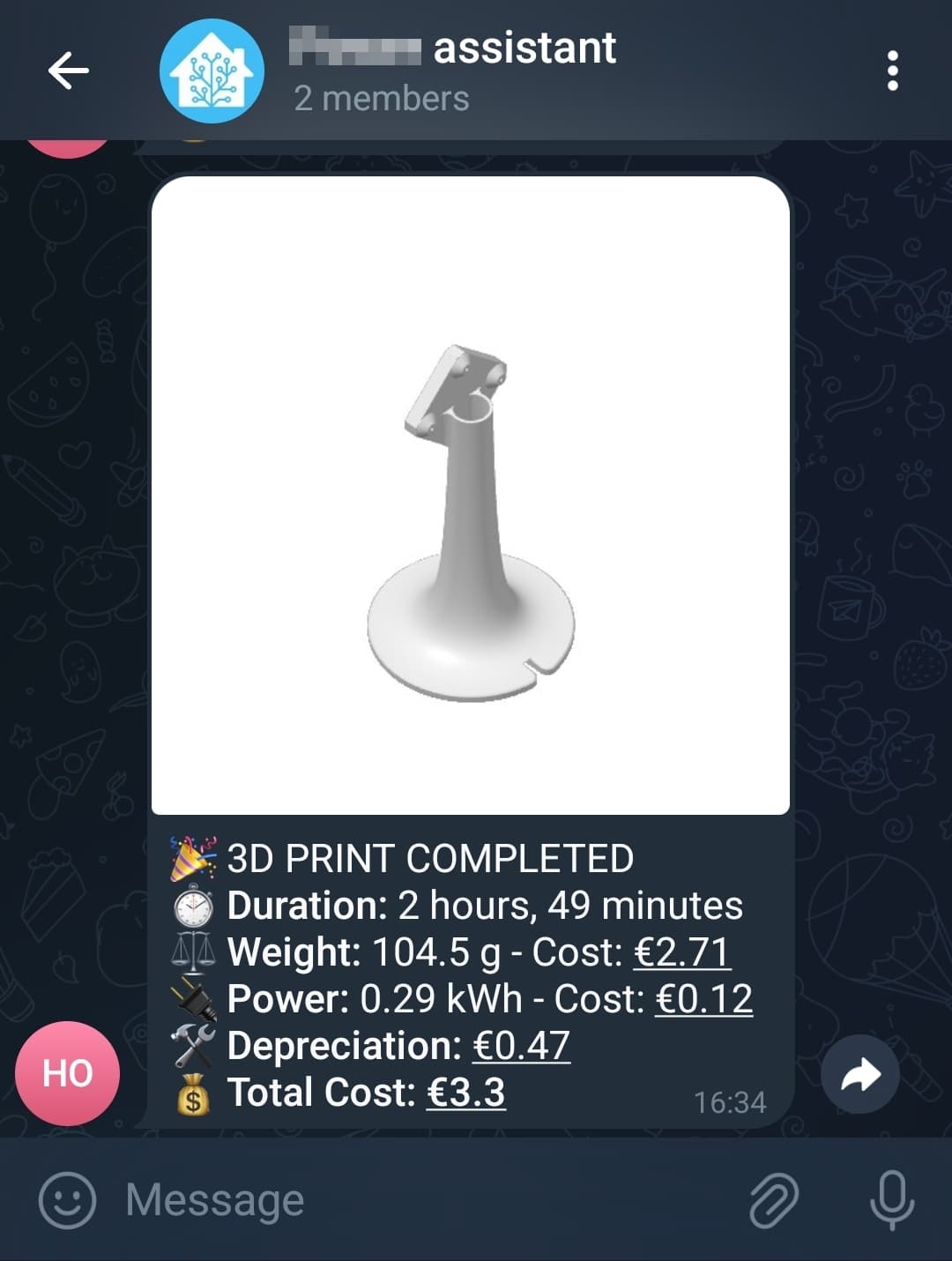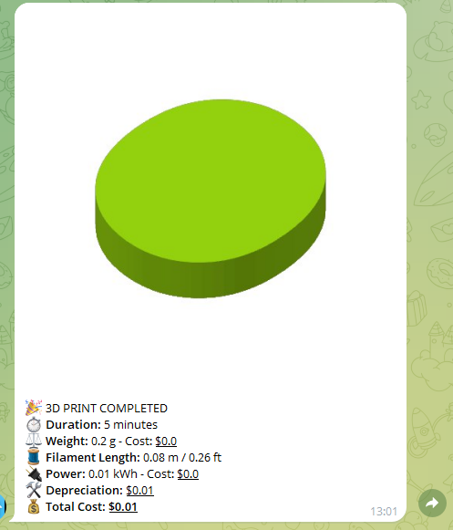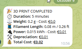 I’ve published a blueprint (it’s my first!) that calculates filament, electricity, and depreciation per-print costs a my Bambu Lab printer and sends a Telegram message (official integration) with a full breakdown and the cover image from the Bambu HACS integration. Filament length is optional.