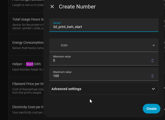 input_number to store the start kWh reading. Create one (e.g. input_number.3d_print_kwh_start).