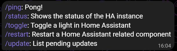 /help: This will display all available commands with a description. The descriptions can be provided and/or adjusted in the blueprint settings. The example below shows two custom commands added using the blueprint (/status and /toggle). These examples are shown in the Custom commands settings section.