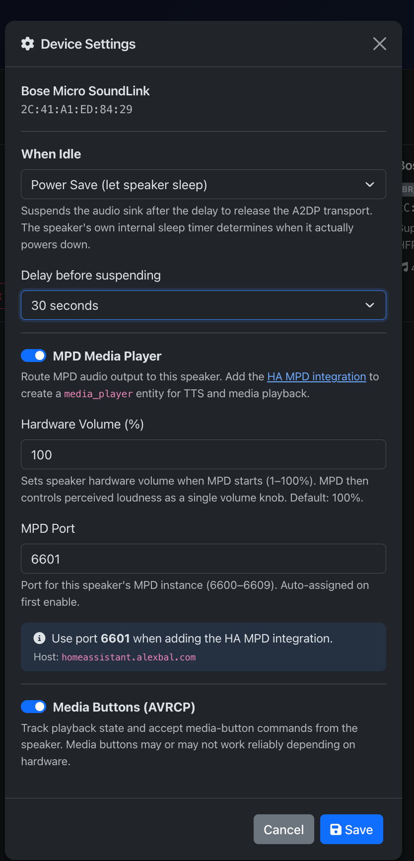 I’ve tried 1.50 release yesterday, it found my JBL 110 partybox, connected and looks fine. I couldn’t find System → Audio , nor any media player entity, so i had to do MDP integration to get it playing. A bit of a hassle but yeah, it worked.