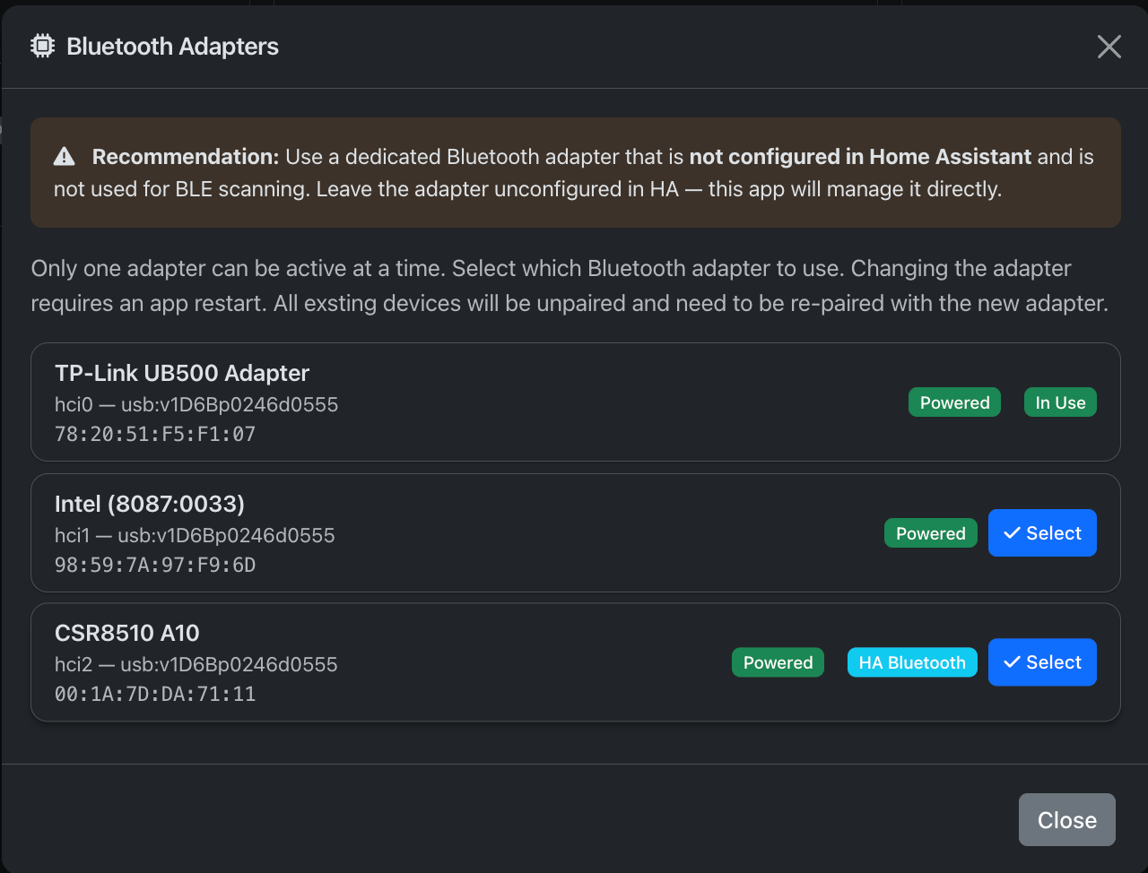 Manage which BT adapter will be used for this purpose (i recommend dedicating an adapter but it should work well with any you have doing BLE/beacons etc)