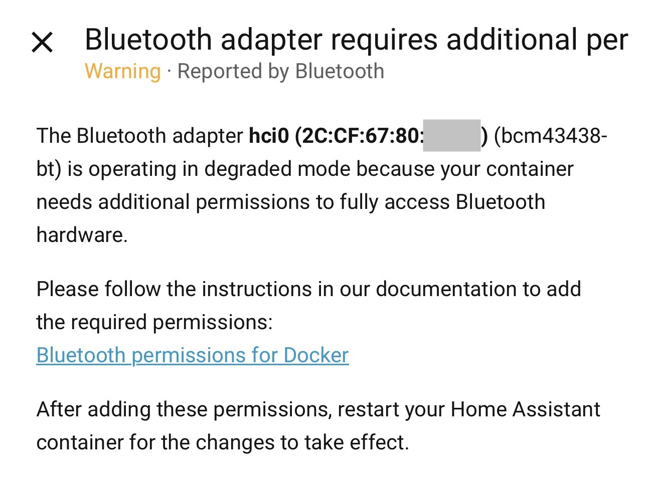 Despite the warning, integrations that rely on Bluetooth seem to work correctly, though there may be slight delays (e.g., with SwitchBot devices).