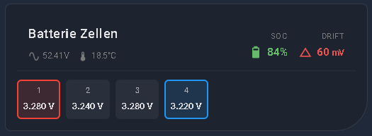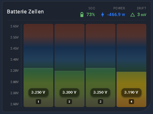 BMS Battery Cells Card is a custom Lovelace card for visualizing the individual cell voltages of your battery storage system (BMS). It provides a clear overview of the status of all cells, including min/max values and balancing drift status.