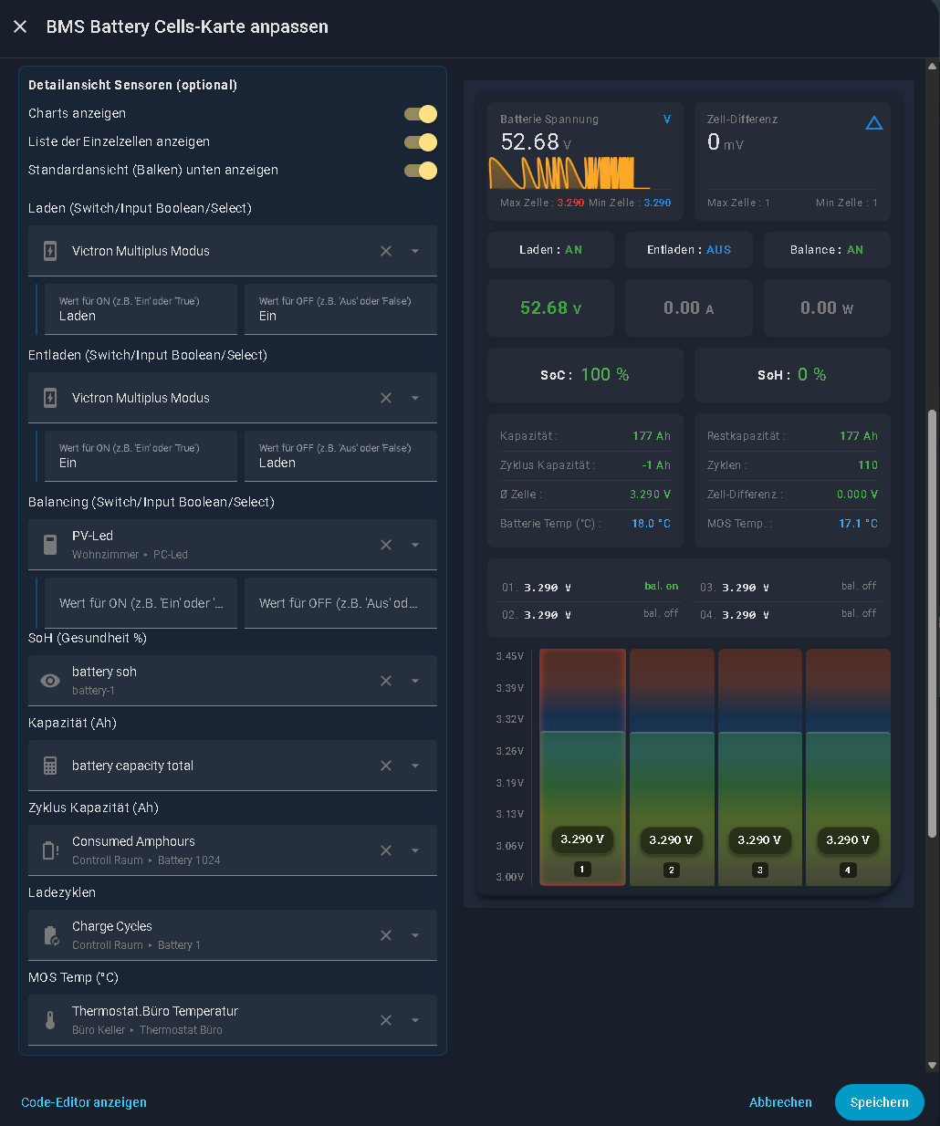 The card can be fully configured via the card editor user interface and is translated to eng and ger. You need the corresponding entities from your BMS (e.g. Victron, JK-BMS, Daly) that provide the cell voltages in Home Assistant. Regular batteries (AGM and similar) also work, as long as you have suitable entities available in Home Assistant.