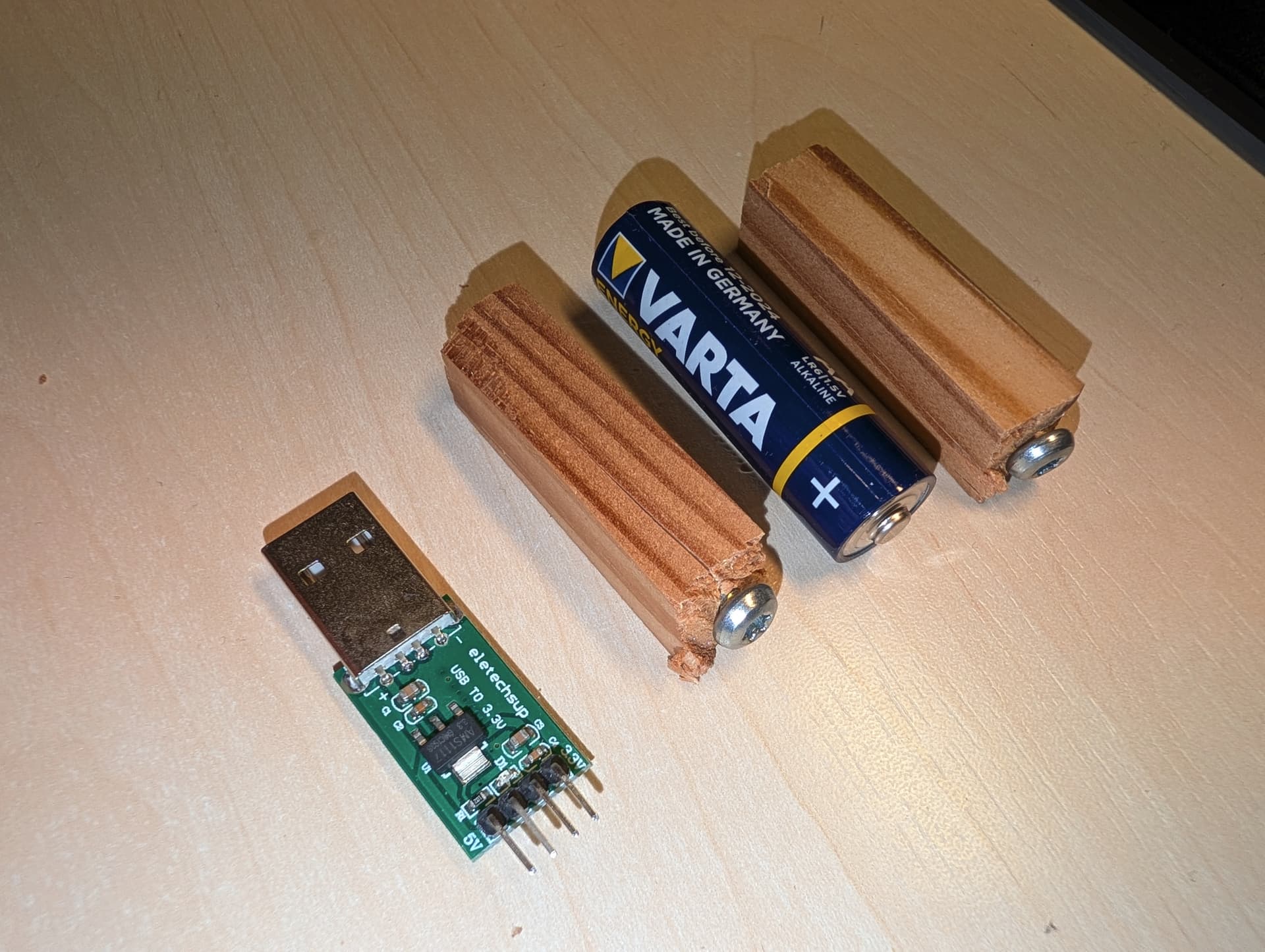 The USB module is a buck converter that outputs 3.3V (= two batteries) or 5V (= 3 batteries).