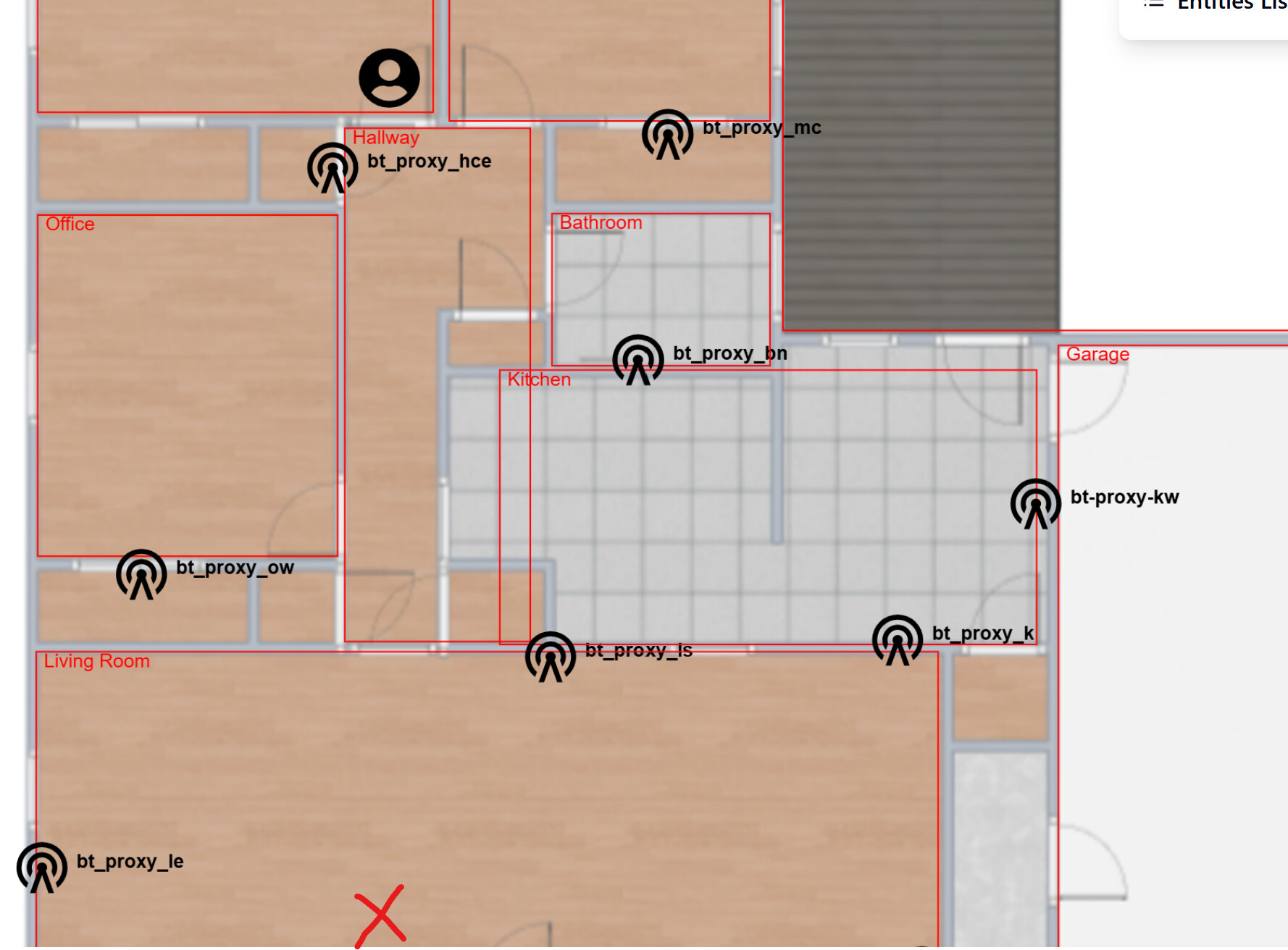 Where these intersect (or there about) is where the phone should be illustrated by the red person icon in the image. It also highlights any issues you might have with settings of the Bermuda devices. They can be sensitive depending on placements and surroundings I have noticed.
