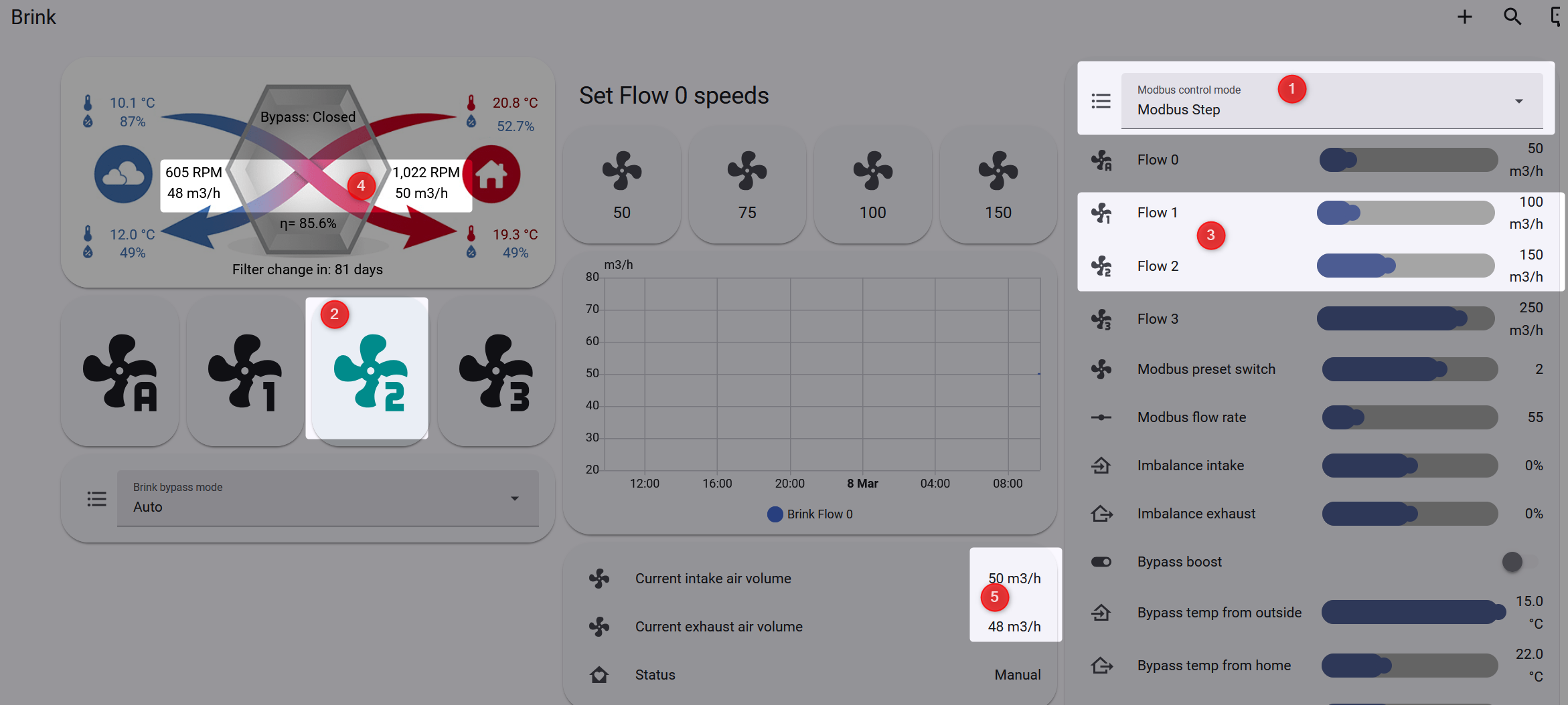 When Modbus is set to flow (1) I can change the fan speed for Flow 0m either using a button I made (2) or the slider from the included dashboard (3). In this case I selected 50 M3 and I can see it is running at 50m3 (4,5,6 and 7)
