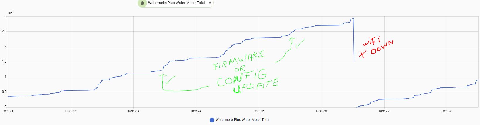 I have one challenge to figure out. If I do a firmware update of the ESP the totalizer does not get reset. But when WIFI drops or power outage for a short moment, the totalizer gets reset.