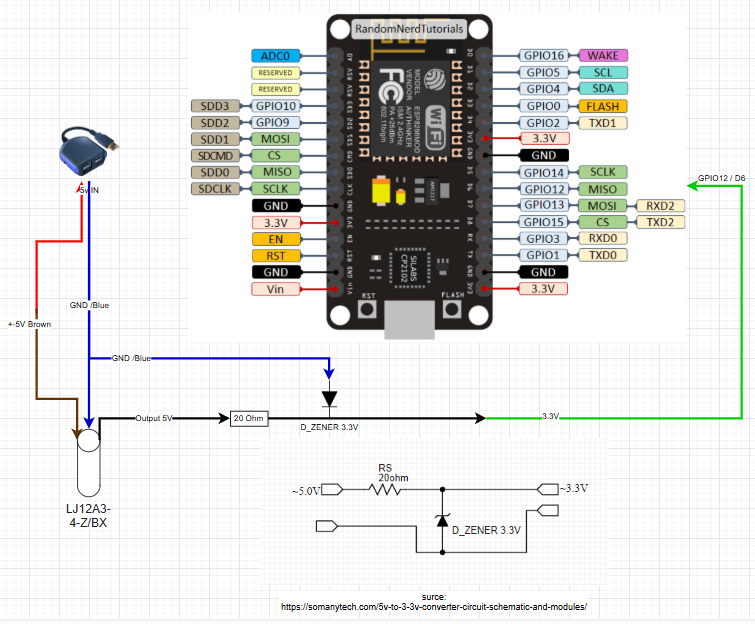 I’ve got a 18A3-8-Z/BX NPN sensor (5VDC 300 mA). LED is blinking when I use water, but the output is around 5V which is too high for a ESP.