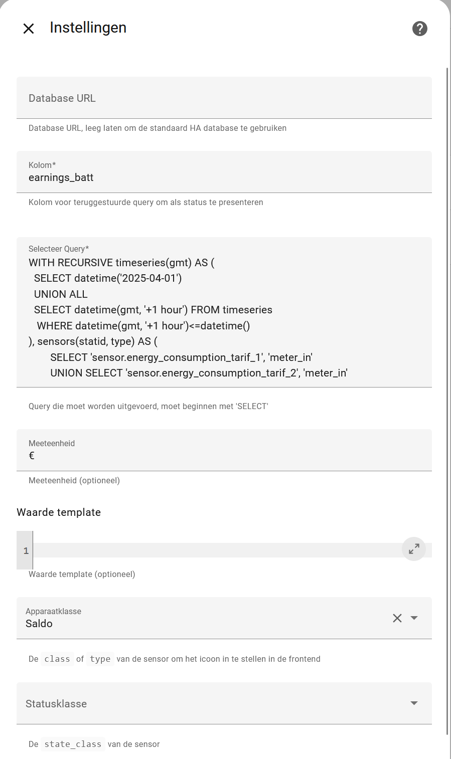 I’ve created an SQL to calculate the earnings of a battery. It suits my needs and I think it’s quite flexible to fit other needs. I’ve used this SQL in the SQL integration so I have a sensor displaying the current battery earnings. Now the SQL: