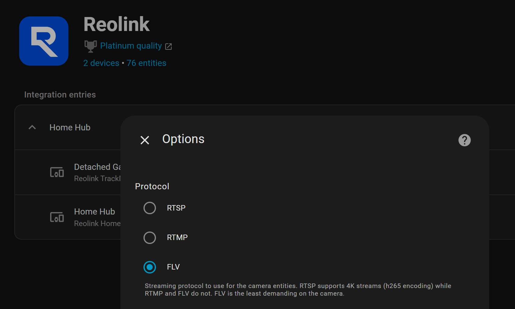 Streaming protocol to use for the camera entities. RTSP supports 4K streams (h265 encoding) while RTMP and FLV do not. FLV is the least demanding on the camera.