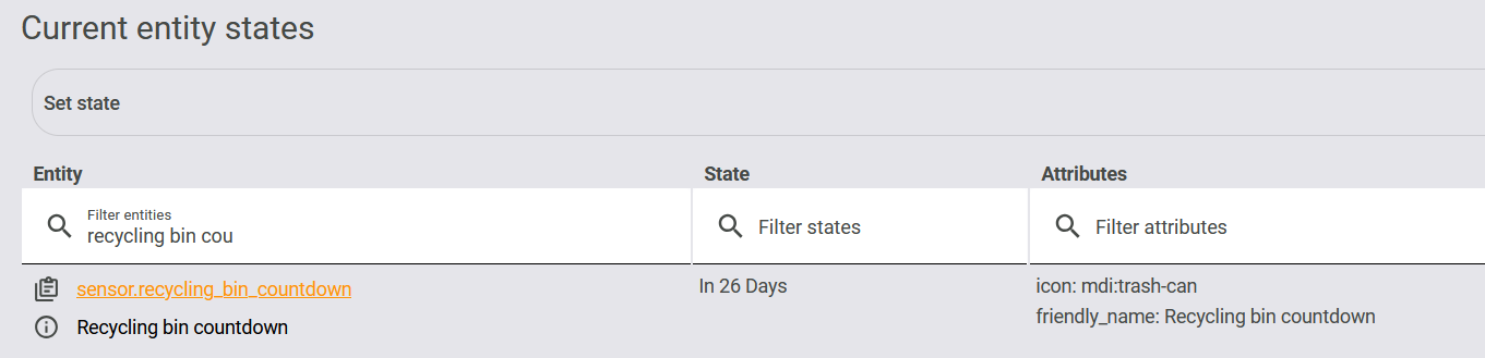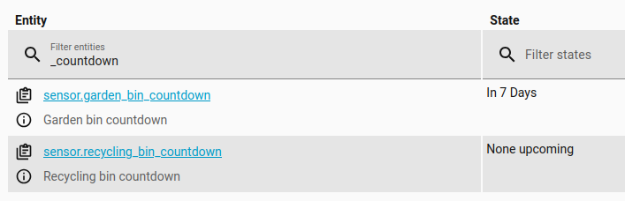 Once these two variables have been calculated, they are used to update the state of my recycling_bin_countdown and garden_bin_countdown sensors, which can have the state “Tomorrow” if the number of days is equal to 1, for example.
