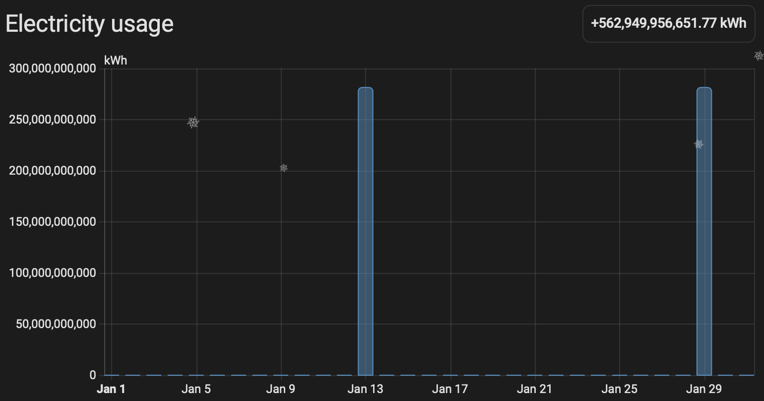 In my Electricity Usage panel for January, I have two absurd peaks that show the total energy consumption for our household over many years for a single day: