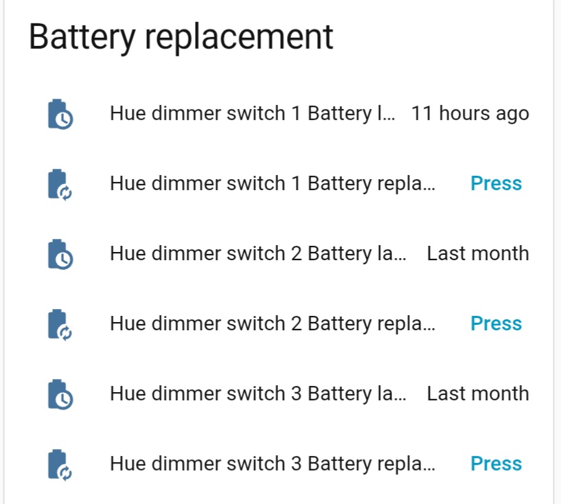 On my dashboard I have an “Entities card” with a long list of Battery-related entities (i.e. for each device a warning when a device’s battery gets low, when it was last replaced and a button to be pressed after replacing the battery).