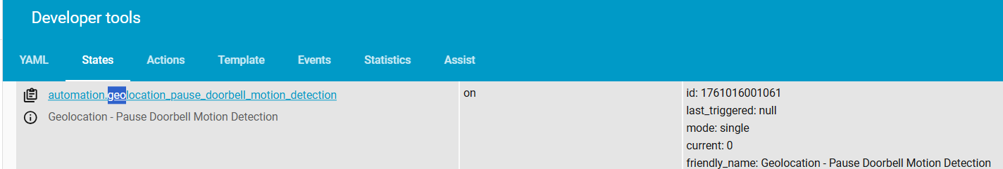 When I returned home today it was the first test of this simple geolocation automation. It didn’t work at all for some reason. My home zone is defined so not sure why this did not trigger. I’m trying to turn off the doorbell motion detection when I return home, for 5 minutes. Incidentally, I did not perform any configuration, HA was already configured for this variety of geolocation. The trigger options are either “Enter” or “Leave” and the zone is “Home”.