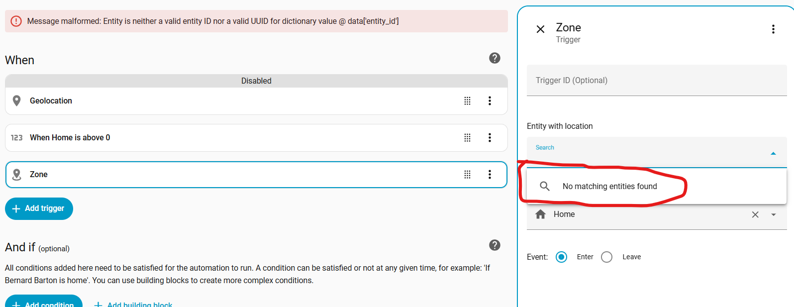 Also when I try to add a zone trigger I get the following error. No matching entities. Any help would be appreciated.
