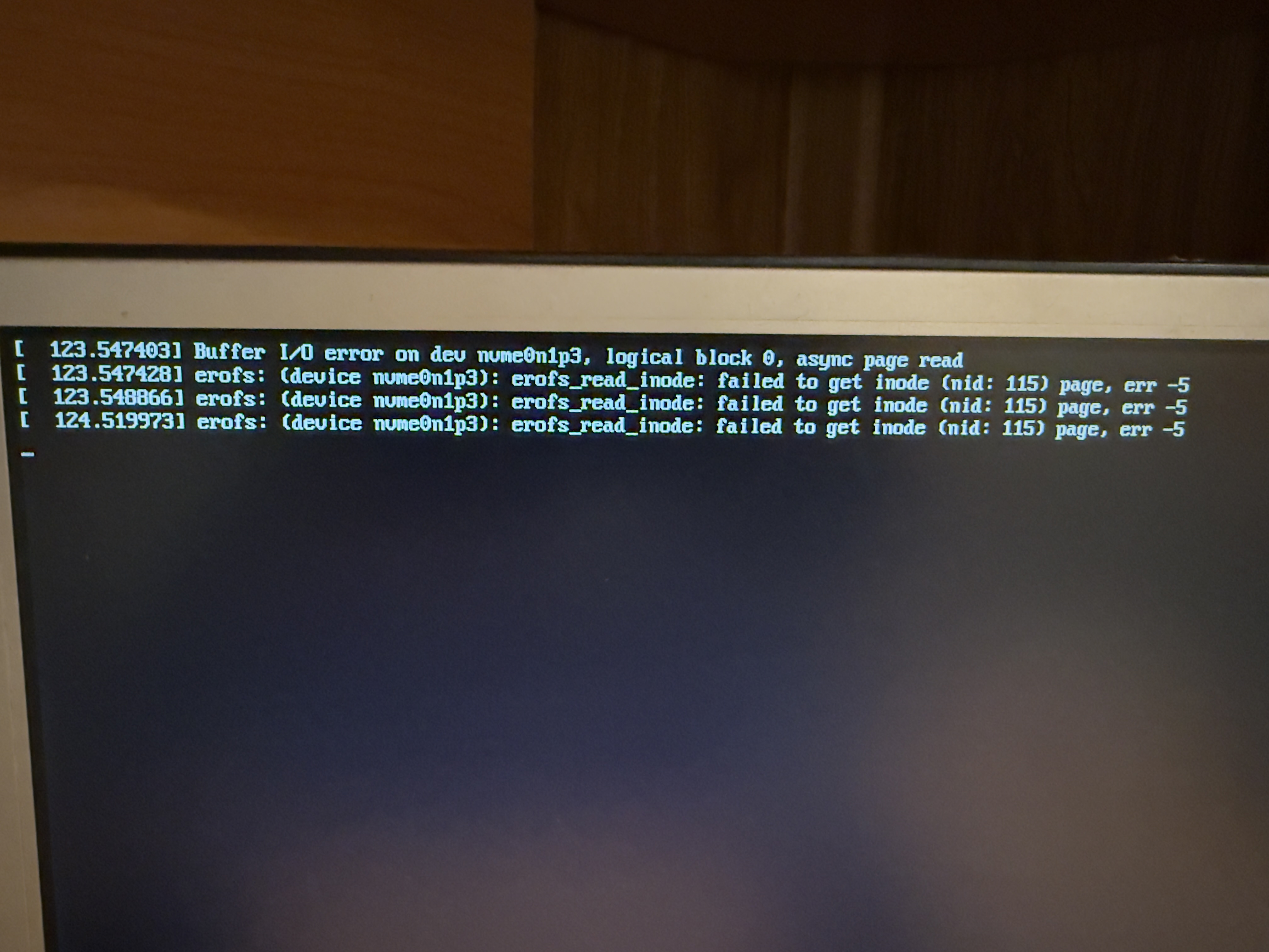 Hi! I’m trying to fresh install Home Assistant on my new NUC with Nvme SSD Silicon Power p34a60. Just done the installation from Ubuntu, then reboot — and catch an error with FS. See the screenshot.