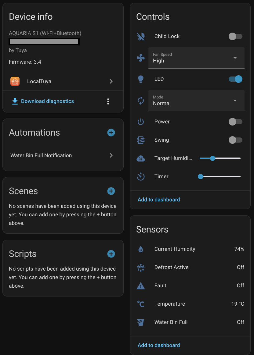 I’m using the dehumidifier in Home Assistant with these entities:
