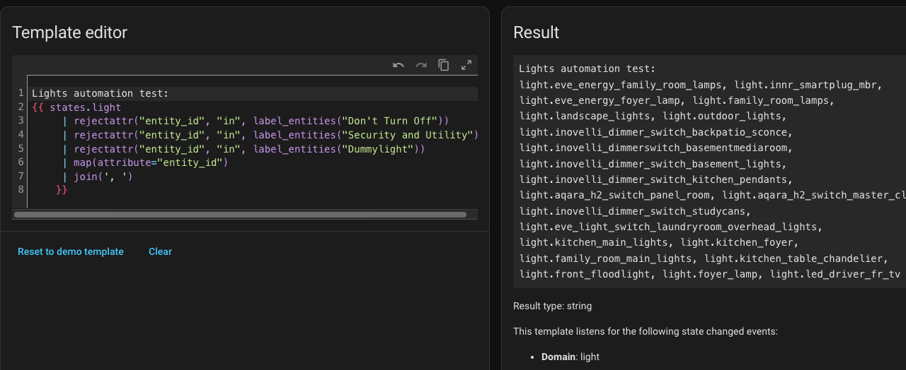 I have a few labels categories for lights that I don’t want to be targeted for this script so I am trying to filter them out. For instance, I don’t want my security camera floodlights to turn off nor do I want my lights around the house that are on timers to turn off so I am filtering by the rejectattr label entities. See below:
