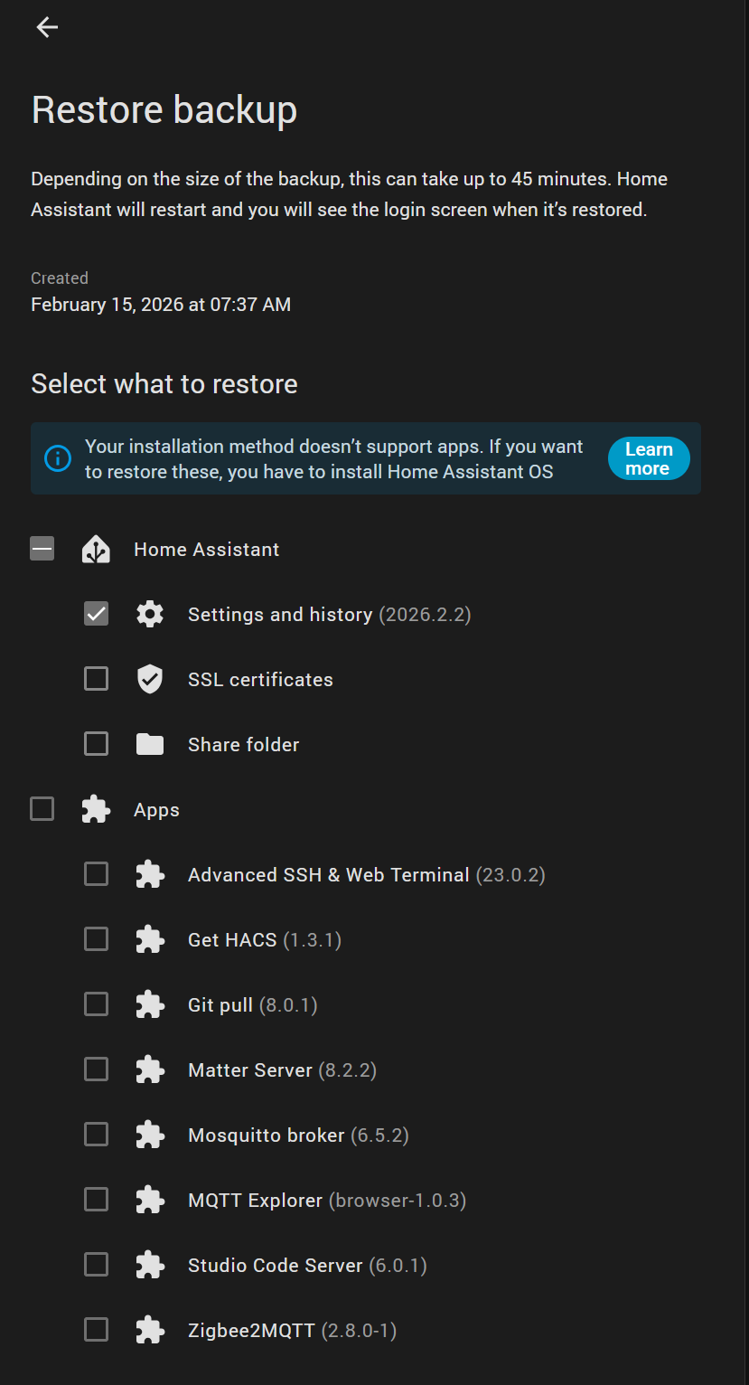 Created a new VM, opted to restore from Nabu Casa cloud backup, and it says “Your installation method doesn’t support apps. If you want to restore these, you have to install Home Assistant OS”.