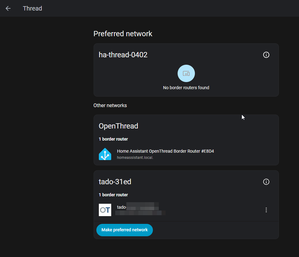 I see no HA preferred Thread network and the other 2nd Thread Network is also showing. Along with the Thread router / network for Tado.