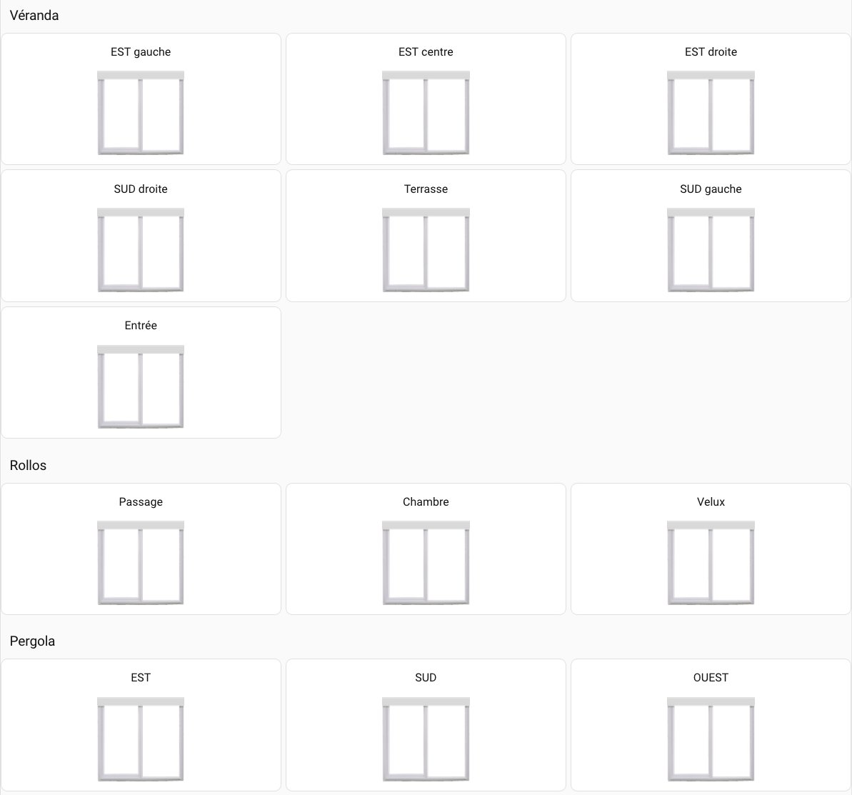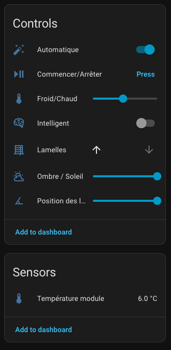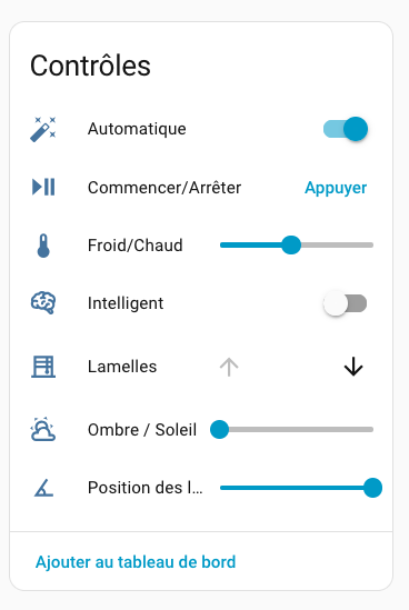 coverplatform: Casambi blinds/shutters exposed as HA cover entities (open/close/position)coverplatform: Winsol Lamel venetian blinds with louvre position slider in degrees (0–142°)switchplatform: Automatique / Intelligent switches for Winsol Lamel Intelligent (Star)buttonplatform: Commencer/Arrêter toggle button (louvres 0°↔142°)numberplatform: Shadow/Sun (%), louvre position (°), Cool/Warm (°C) sliderssensorplatform: environmental sensors for Sensor Platform V4 (wind, solar, rain, PIR) + Lamel module internal temperature