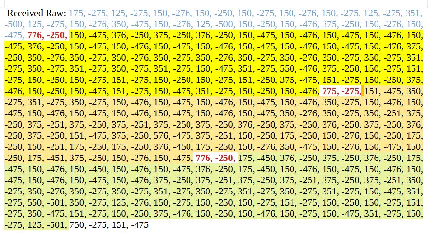 [11:56:18.095][I][remote.raw:028]: Received Raw: -325, 251, -525, 75, -100, 125, -376, 75, -200, 125, -625, 50, -50, 100, -626, 75, -75, 125, -250, 50, -176, 175, -50, 125, -125, 75, -175, 125, -150, 100, -125, 101, -75, 100, -450, 75, -150, 175, -401, 150, -650, 150, -201, 75, -125, 75,
