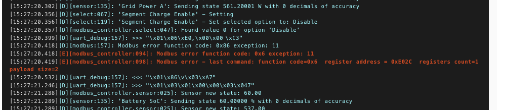 Esphome prints exception 11. If that’s dec, protocol sheet gives: