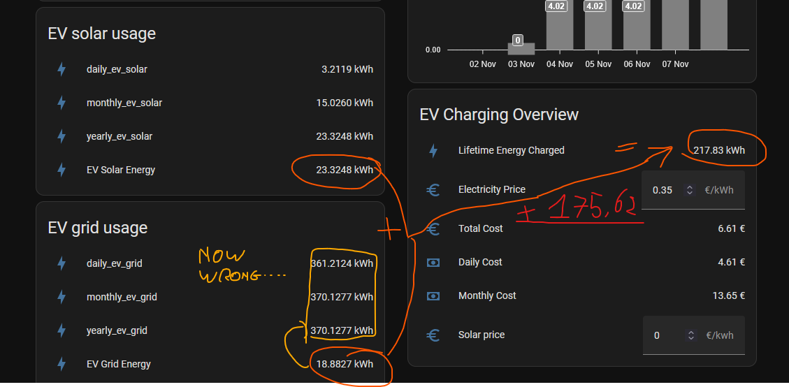 So, to start of, i’m building a dashboard that basically tracks my Electric vehicle (EV) charging & costs. I want to be able to pay the correct amount of electricity used for my EV in my household. This is going well as i made a split calculating what part of the energy is from Solar, what part is from Grid etc. and i added costs to those & even a comparison to an ICE car fuel consumption what i have saved.
