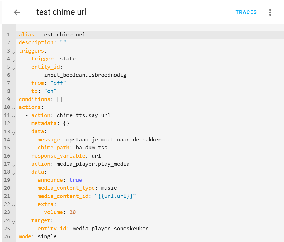 Thatโs it. No need to pause music. Mess with volume. Store things in variable to later call. Just use Chime TTS to get a url for your announcement, and send it to your Sonos using the built in โplay.mediaโ action, making sure to have โannounceโ set to true, add the extra volume line if you like.