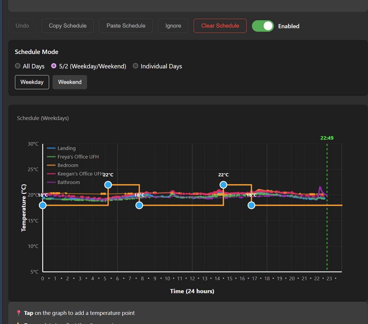 Double-click on the graph and it should add a new node, click on it to get an extra UI below the graph for extra settings, drag the node to move change time/temperature values. If you are in an active time period the temperature should be updated immediately, if you reboot your server it should also check and update to the current scheduled values too.