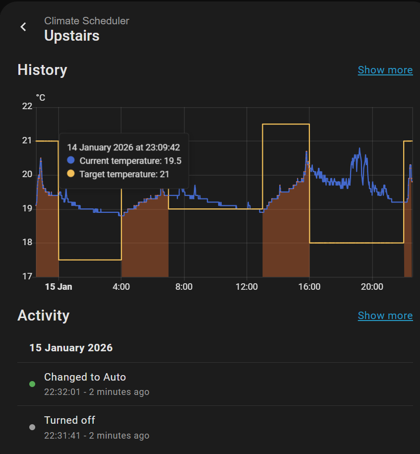 The Climate Scheduler doesn’t actually do anything smart, it just sets the climate entity to the settings you request at the time you set them in the schedule. The rate is just a sensor so that I can see how my rooms are behaving, they aren’t currently doing anything clever. Someone requested I expose data that Intelligent Heating Pilot could use to automate with but they haven’t been able to test it yet. That uses Versatile Thermostat underneath which I need to look at too as it’d solve a lot of my problems.