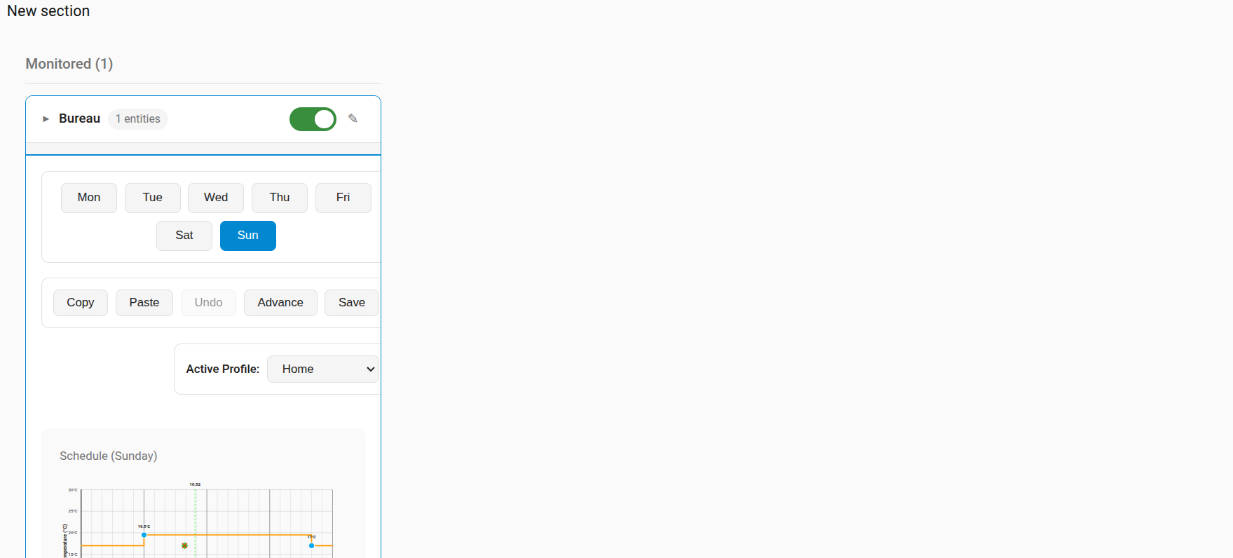 With the two profiles defined above, I can select for example Home profile for Monday in the Active Profile selector. then the climate scheduler immediately displays the profile of the current day (in my case Sunday whereas I would like to keep seeing Monday).