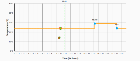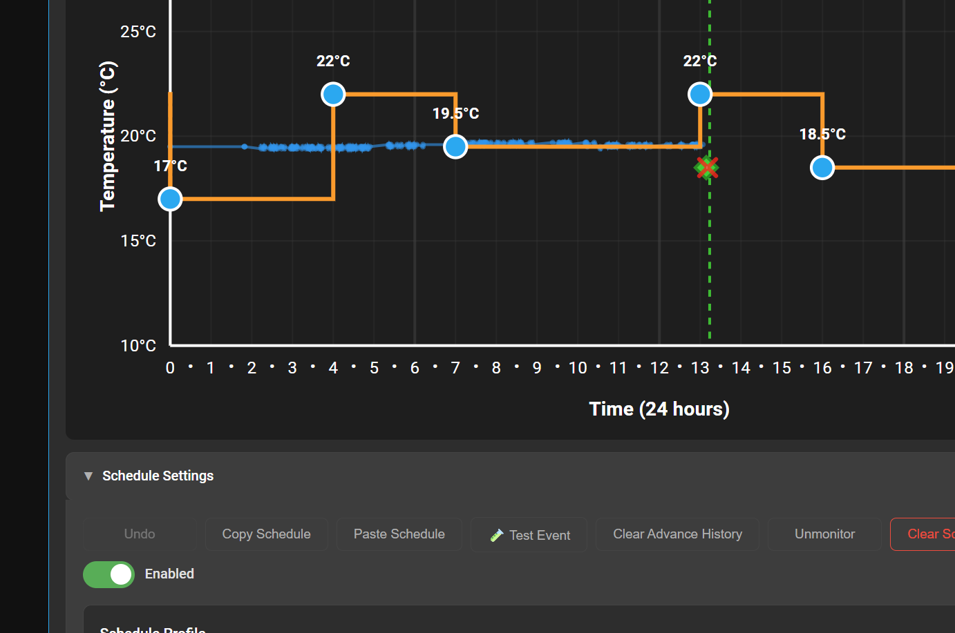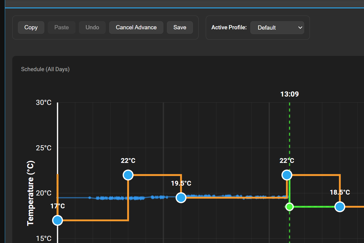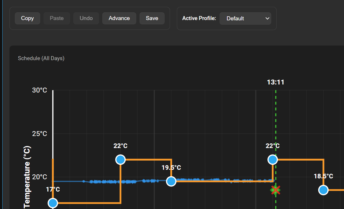 The green boxes show times when the schedule advance feature was activated, this instantly applies the next node in the schedule. For example, if you get home early you can activate this to warm up the house. It will show a green dot at the time you clicked advance and a green line to the next node, this shows it’s a temporary adjustment. If you then click “Cancel Advance” it goes back to the original schedule and leaves a red cross behind at the time you cancelled. I thought this useful so that you can see when people wanted the schedule to change and maybe adjust it.