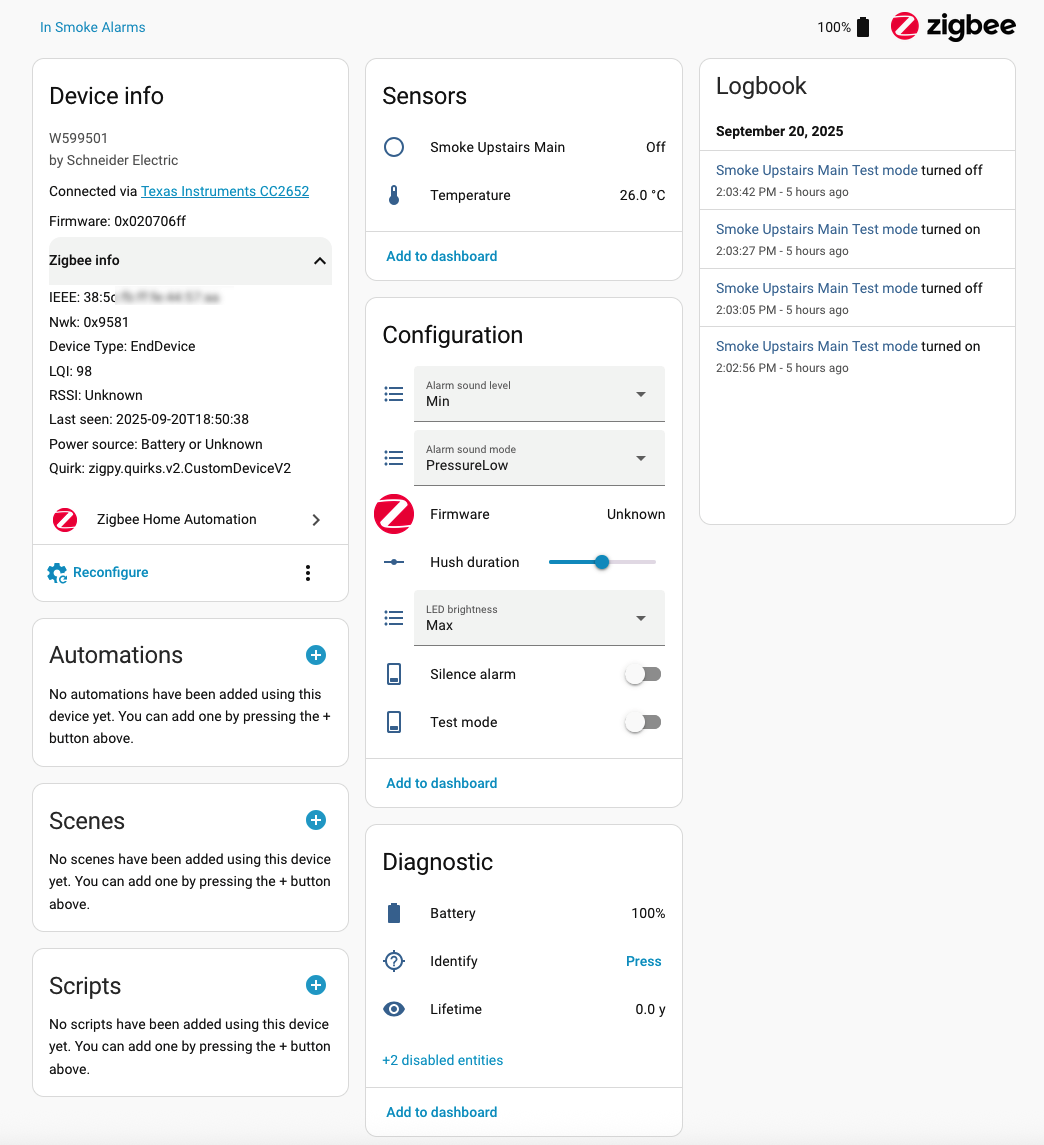 These are quite pricey and compared to the Nest Protect are very simple devices. There is no carbon monoxide detection, no voice notification, no warning before smoke reaches a higher level, etc. It’s basically a normal smoke detector with a Zigbee switch for Smoke.