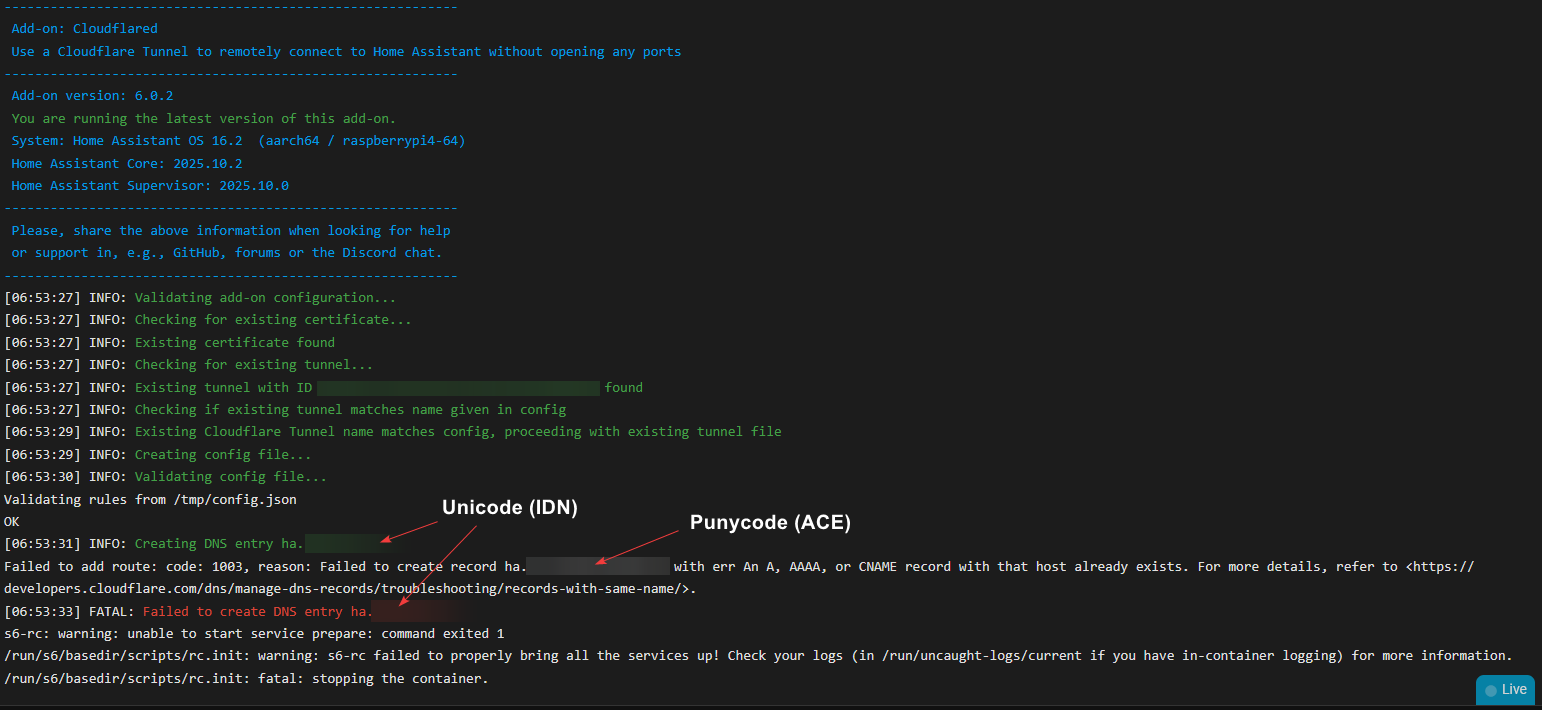 Everything works great once it’s running, but I’m having an issue whenever I need to reboot or restart my Home Assistant system. The Cloudflared add-on tries to recreate a CNAME record in Cloudflare, and since it already exists, the process fails and the add-on stops.