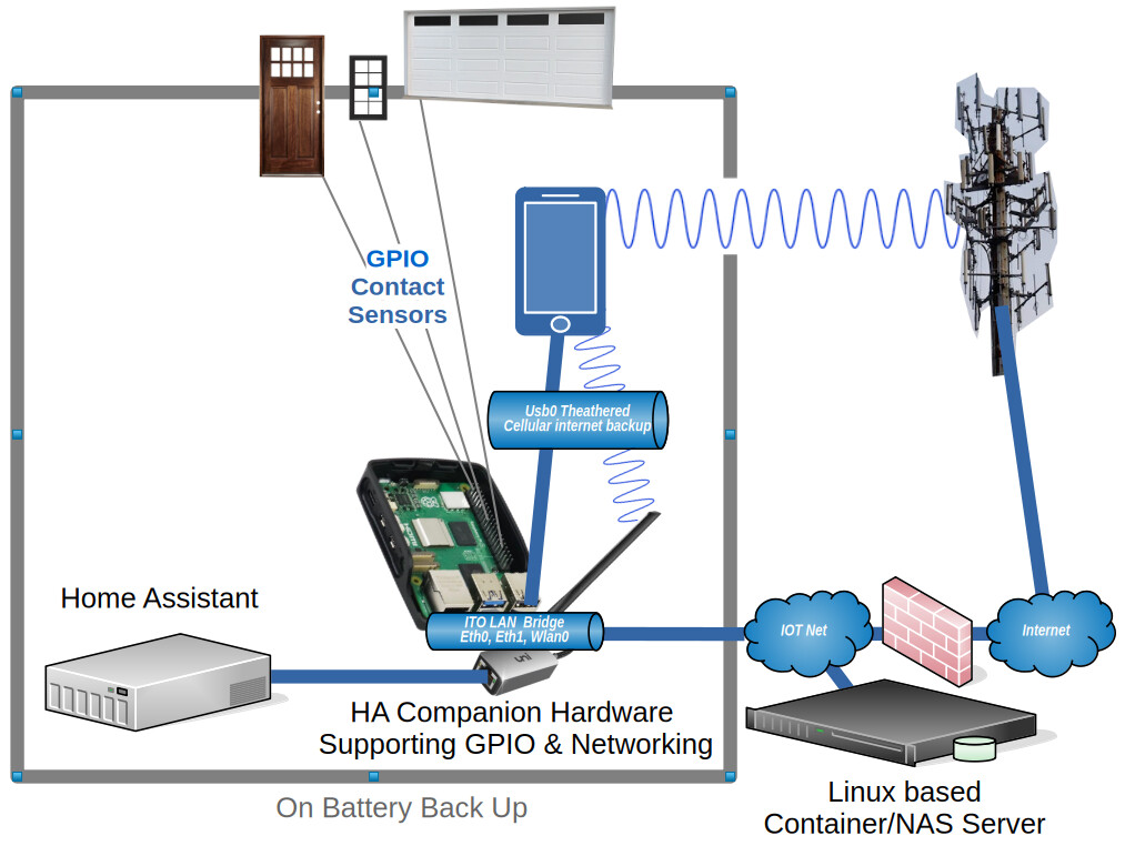 I still want to have the contact sensor and redundant internet connections while I live in the house. Once we sell the house, I want to make it easy for the new home owner to use or remove features, or completely disable the smart house if they desire. My HA controller is now running HA OS. My companion system is using a Rasberry pi 4 with Rasberry pi OS handling the GPIO integration and networking.