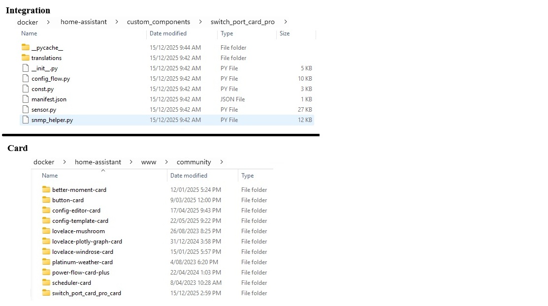 Can you doulble check something else for me. In first instance i hoped the card and integration would install together (but did not easily find an example on this nor specifics in the HA documents) so also added to card in the integration repository (hoping it would take care of putting it in the right directory already for use so only thing left would be resource declaration as your are doing). In my installation it did not work / not copy (certainly not register). Can you check your /www/community/ directory if there are 2 similar swtich_port_card_pro directories? (expect not but some people claim with registration that a second card is there which i am trying to figure out how that can be if nothing in the integration registers a card). But apparently there are difference regarding the different types of HA installation that cause some issues i fail to understand at the moment. But am sure at some point we will figure this out