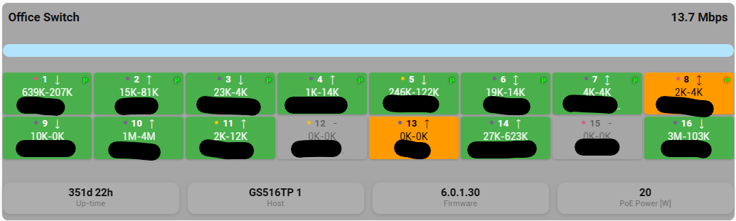 Hi @partach, just wanted to say thank you for this network switch status card. I was thinking the other day that it would be nice to add my switches to HA, but when I started reading about configuring the SNMP integration I became less interested . I managed to get your integration installed but had to manually add the dashboard resource to use the card.