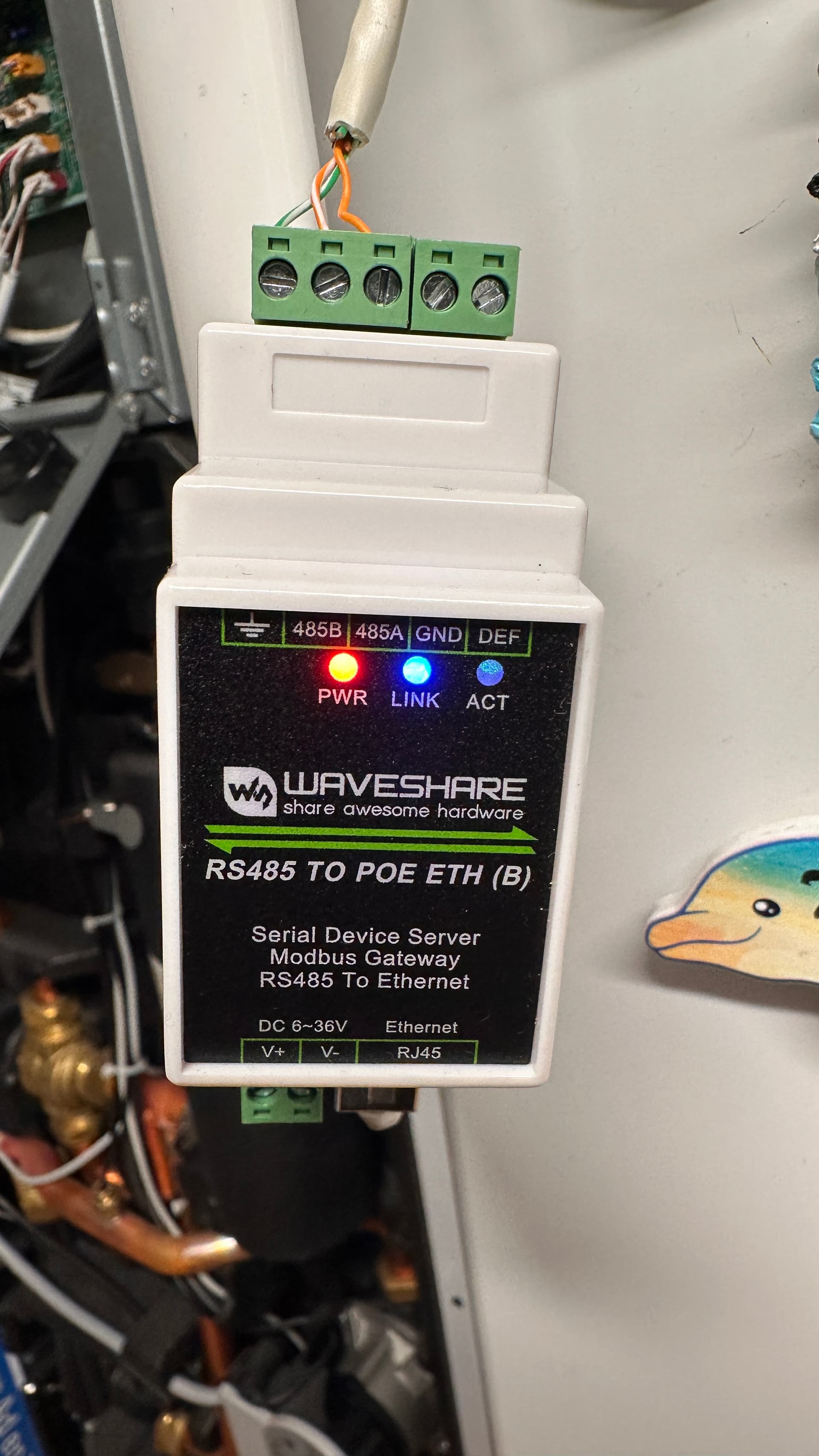 Is the red led on the GTW-08 only green when communicating with the waveshare? I have the waveshare RS485 TO POE ETH (B) connected to the GTW-08 on my Eria tower heatpump. But the light stays red. I can reach the waveshare via the IP and can config the waveshare. But thats all. Also no rx/tx flashing. Does anybody has some tips to continue?