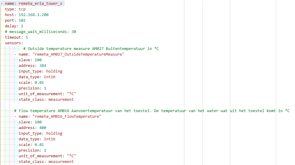 {‘name’: ‘remeha_FlowTemperatureReceived’, ‘slave’: 100, ‘address’: 273, ‘count’: 1, ‘input_type’: ‘holding’, ‘data_type’: ‘int16’, ‘scan_interval’: 5, ‘unit_of_measurement’: ‘°C’, ‘state_class’: ‘measurement’, ‘scale’: 0.01, ‘precision’: 1},