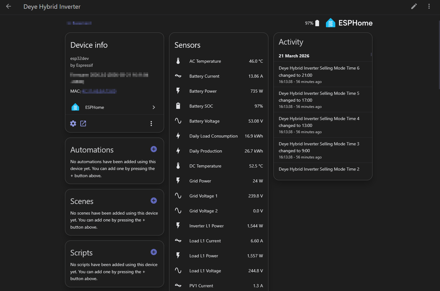 I just want to share how I managed to pull data from our Deye 8K Hybrid Inverter (SUN-8KSG05LP1-EU) into HomeAssistant.