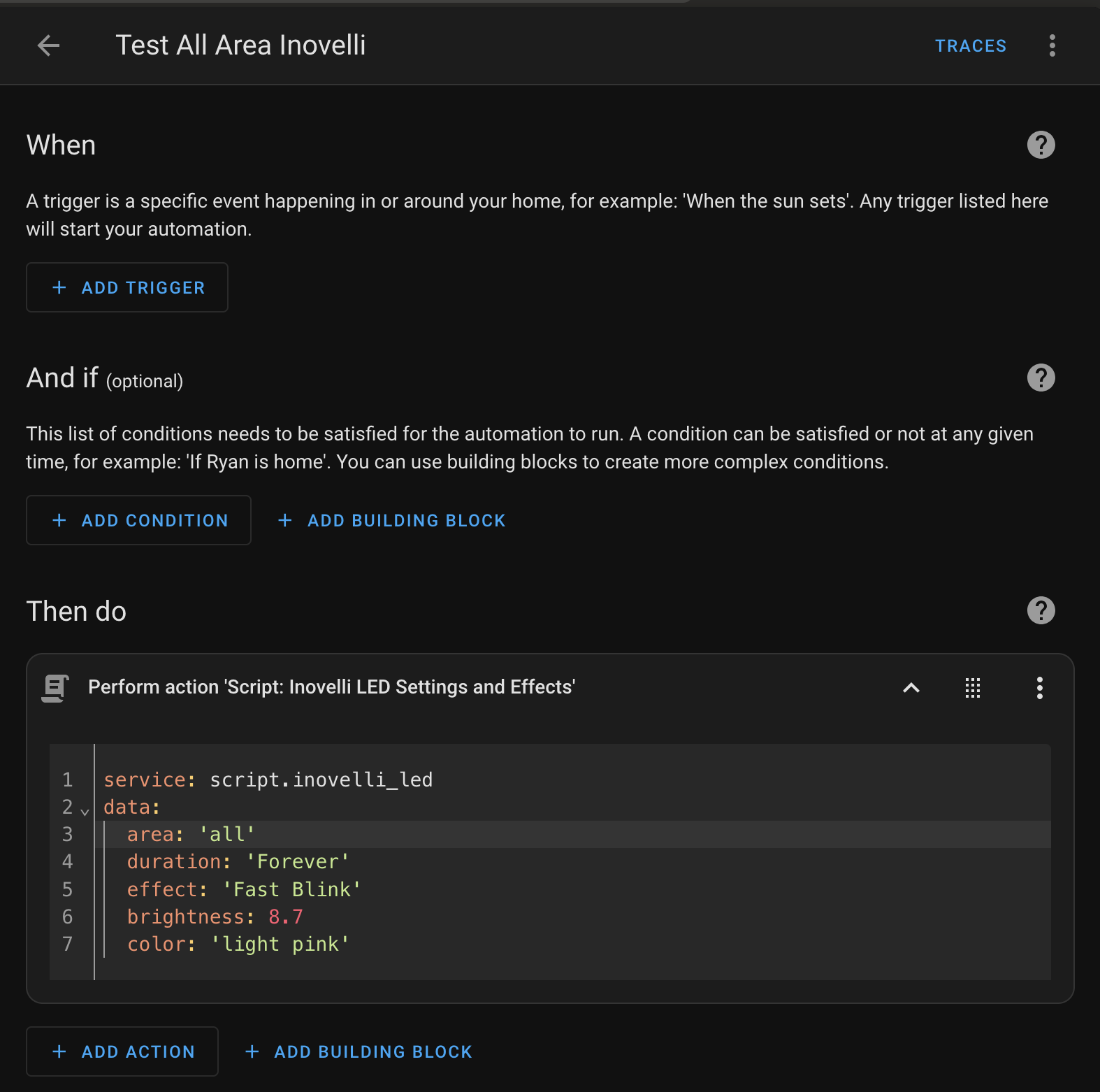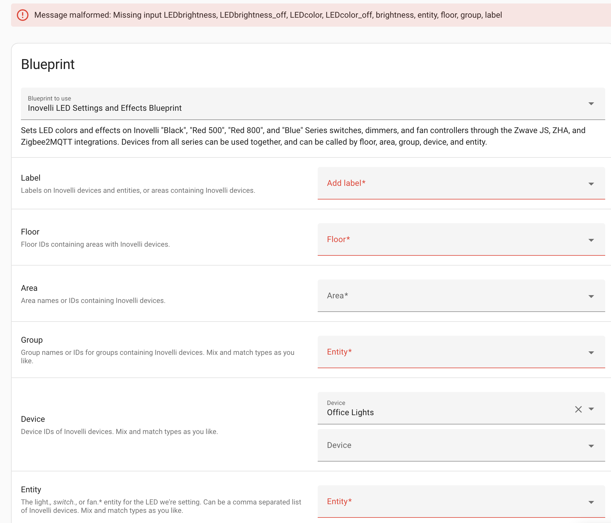 Did you import the blueprint and then call it like a script from the Developer Tools → Actions tab? I don’t think that will work. If you imported the blueprint, you’ll have to navigate to Settings → Automations & Scenes → Blueprints (at the top), click on my blueprint (whatever you named it) to open the configuration UI. Configure it however you’d like and save it as a script. It’s then a static script which won’t accept inputs from the Actions tab. In other words, you can’t set it for red one time and blue another time. You’d need to open the blueprint, configure it for red, save it as Inovelli_red_leds and then do it again to generate inovelli_blue_leds. Calling those will do the needful but you need to save it as a statically-configured script for each configuration you want.