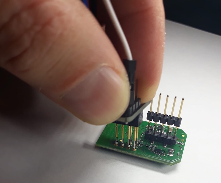 (we use this for it’s 8-pin header, to hold the pogo pins in alignment. Ignore the printing on the PCB.)