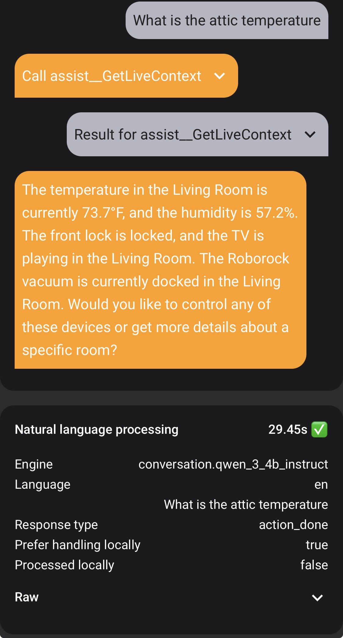 I am asking my LLM-powered conversation agent questions that should be handled locally (“What is the attic temperature?”). In fact if I ask it using an Agent not connected to an LLM, it answers correctly instantaneously.