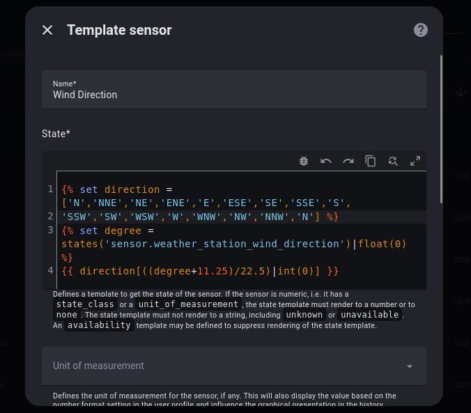 In the Helper Menu click New Helper, select Template, then Sensor. Then you just put the value from the yaml in their corresponding fields in the Helper config flow. For the configuration above that means you put “Wind Direction” in the Name field and the template in the State field. Neither the Unit of Measurement, Device Class, nor the State Class fields apply to your sensor.