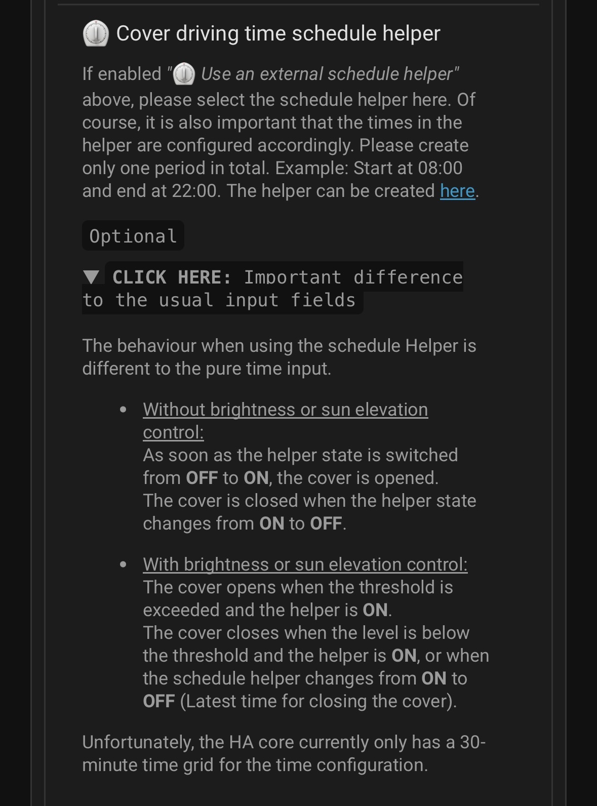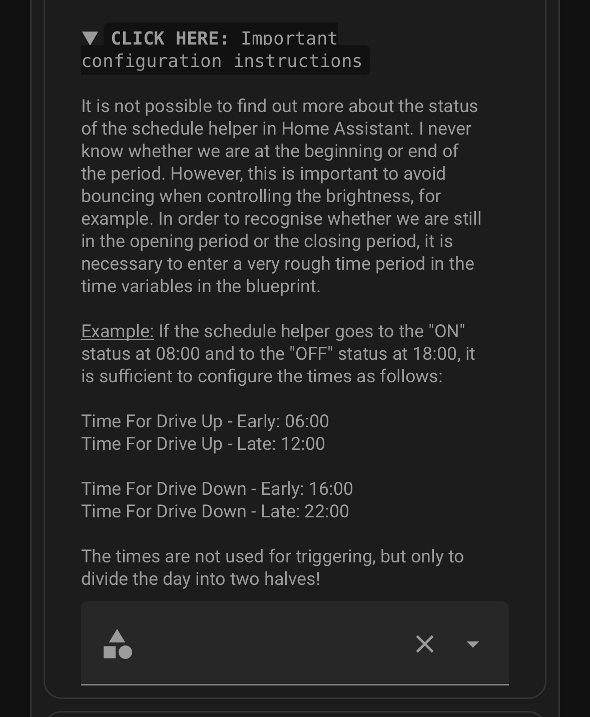 If I set the time for “time_down_early” to 2:00 PM, the shutters could close as early as 4:00 PM due to sunset. That’s exactly what I want to avoid in the winter months, as it’s too early then - so I set the earliest closing time later. At least, that’s how I understand it. But I still don’t understand what this schedule is actually for. ![]()
