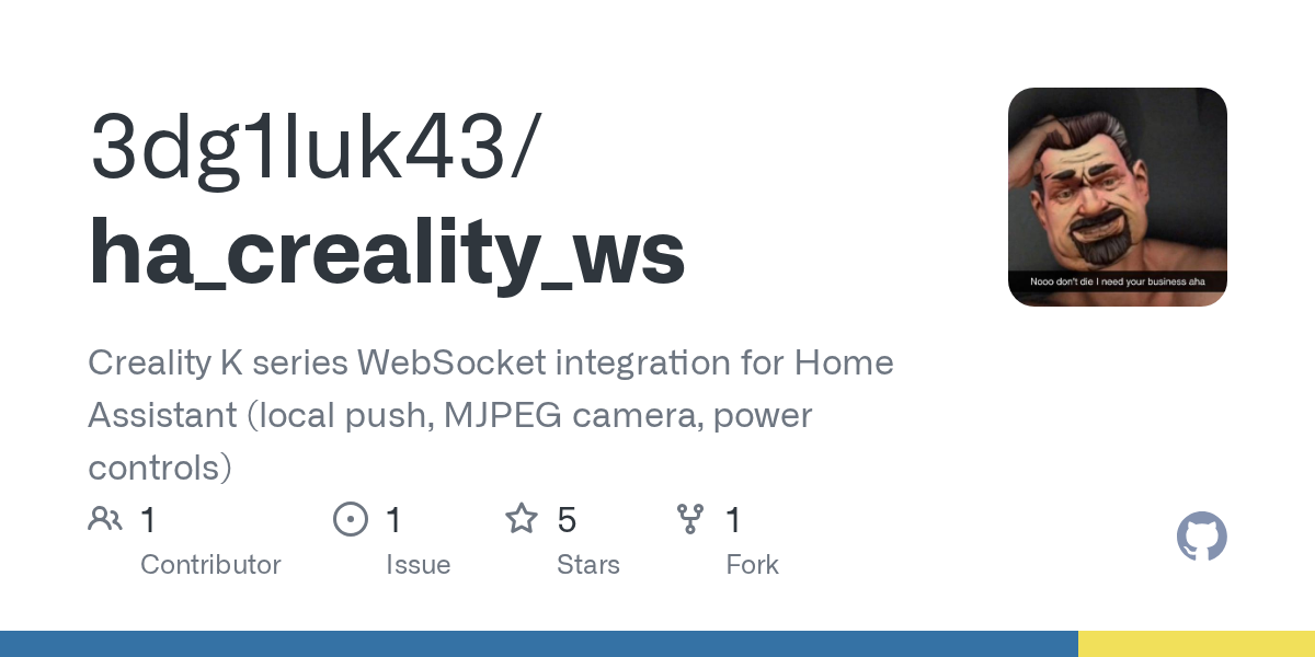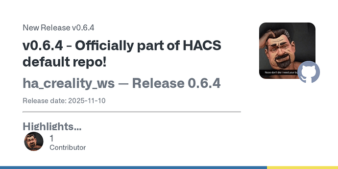Hey all, I’ve been working on Creality K-series printer integration and custom card. I’m still ironing out bugs and currently K2 webrtc camera is not yet supported. K1/K1C/K1 Plus MJPEG based camera stream should work. Enjoy!