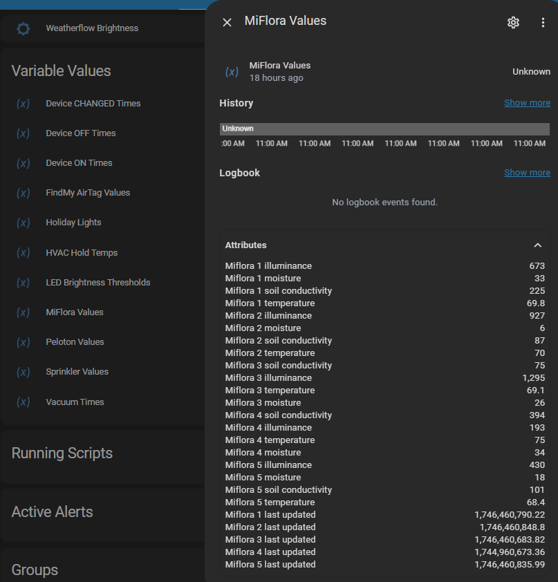 Example above shows some Miflora BLE moisture sensors. Automation populates the variable(s) upon update. Other variables shown on the top-left of image.