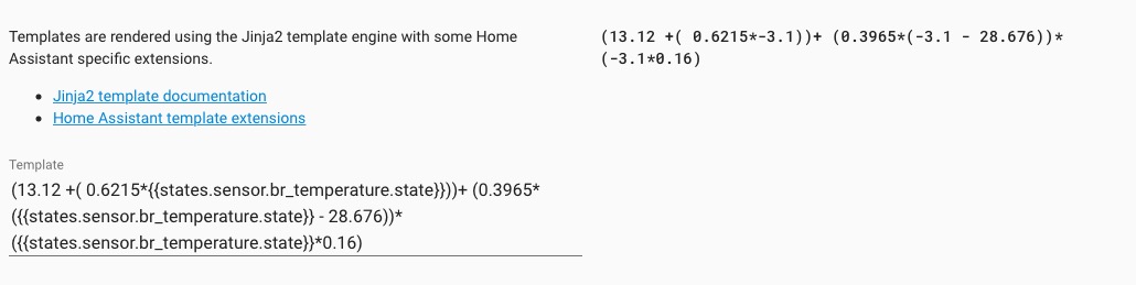 value_template: "{13.12 +{ 0.6215*{{states.sensor.br_temperature.state}}+ {0.3965*{{states.sensor.br_temperature.state}} - 28.676}*{{states.sensor.br_temperature.state}}*0.16}"